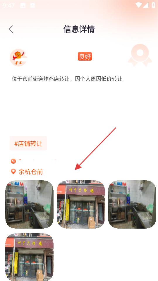 4、信息詳情頁顯示倉前街道炸雞店因個人原因低價轉讓,標注店鋪轉讓 標簽和余杭倉前地址,配有店鋪內部及外觀等多張圖片。