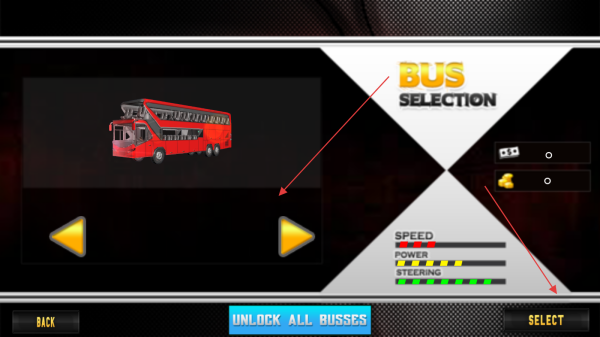 2、玩家在巴士選擇界面,查看不同巴士的屬性如速度、動力、轉向等,選擇心儀的巴士,點擊SELECT按鈕確定。