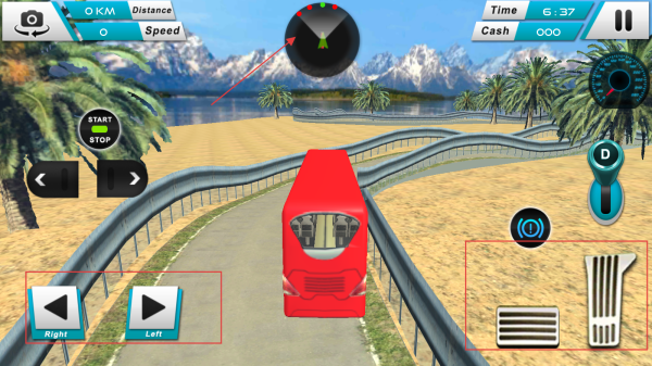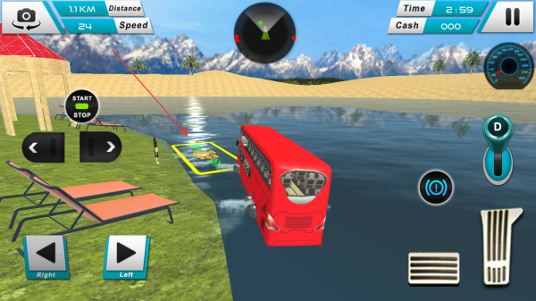 3、通過屏幕左側的左右方向按鈕控制巴士轉向,右側的踏板控制油門和剎車,根據上方的羅盤指示在道路和水面上駕駛巴士。