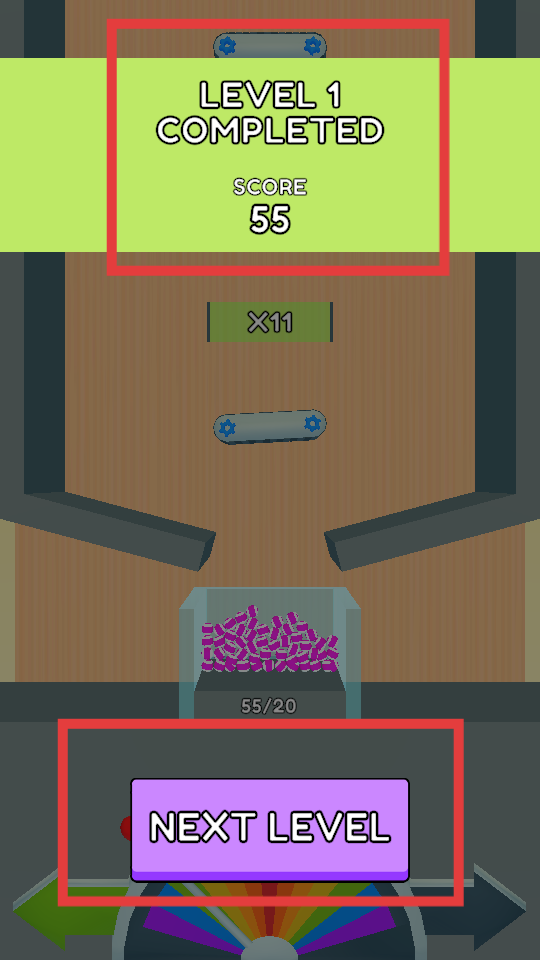 3、當收集的小球數量達到關卡要求,關卡完成,會顯示得分,點擊屏幕紫色按鈕進入下一關,繼續通過傳送帶增加小球數量。