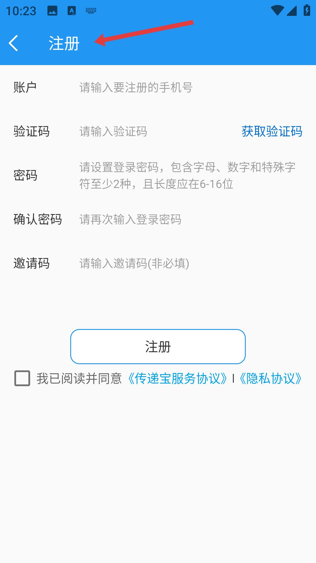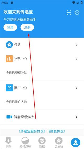 1、打開傳遞寶app,進入主界面后點擊注冊按鈕,跳轉至注冊頁面。