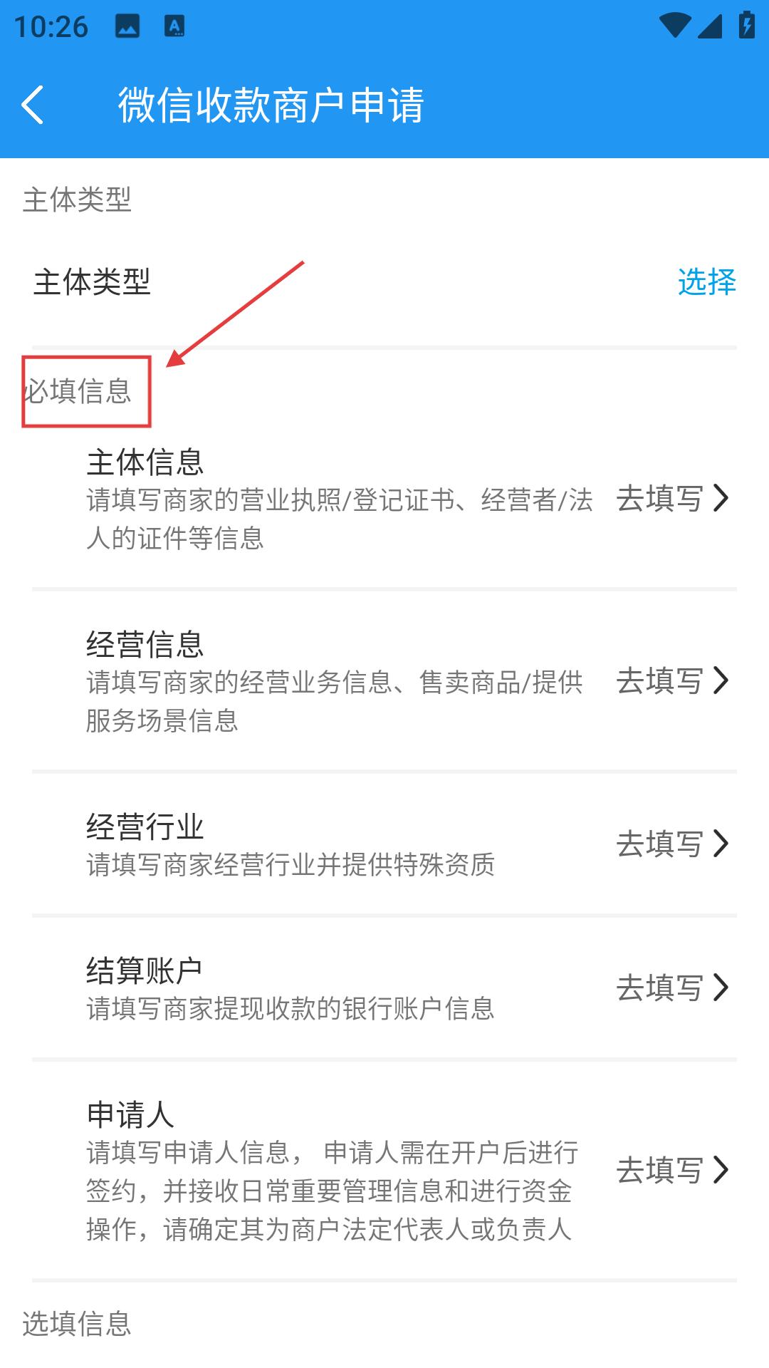 3、進入微信收款商戶申請頁,按要求完善主體信息經營信息等必填內容,提交申請開通收款。