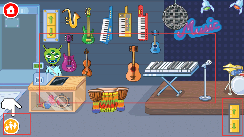 4、進入Music店鋪,有各種樂器陳設,與店員交流,也能探索樂器相關玩法,還可通過箭頭按鈕在不同樓層或區域間切換。