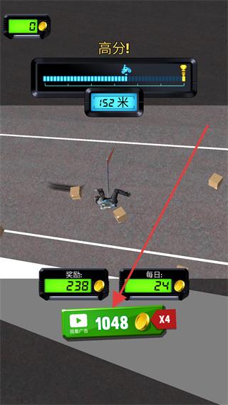 4、若摩托車行駛失敗游戲結束后,然后選擇繼續挑戰,再次駕駛摩托車,積累更多的特技挑戰經驗,爭取行駛更遠的距離,獲得更高的分數。