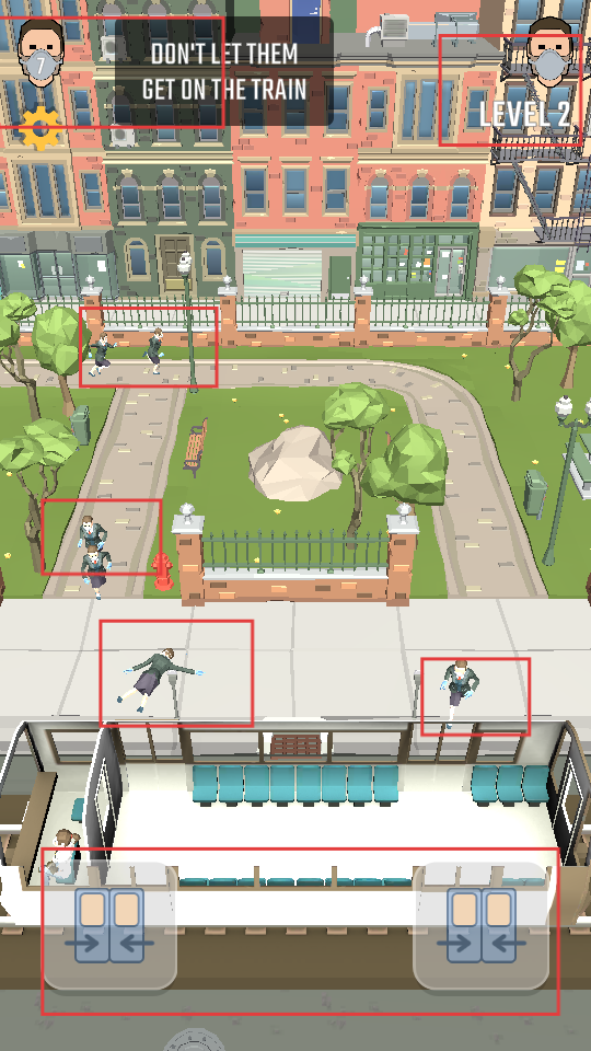 2、在關卡中利用場景內的元素和操作方式,對試圖登車的人物進行攔截,每成功阻止一次,推進關卡進度。