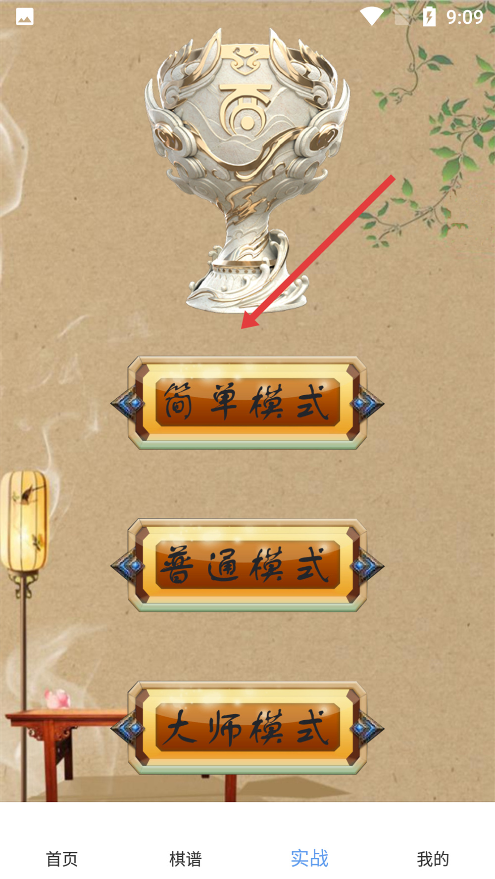 2、在實戰模式選擇界面,根據自身棋藝水平,挑選簡單模式普通模式或大師模式,開啟對局。