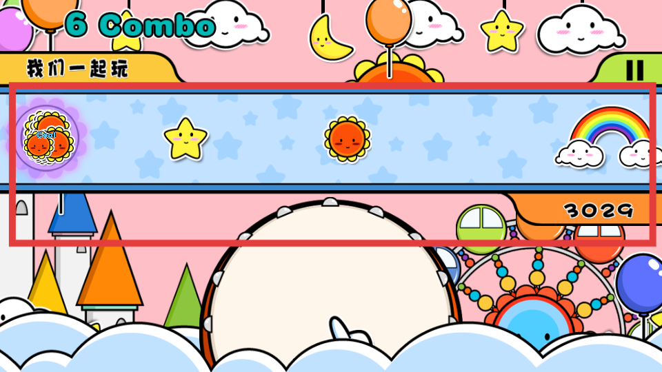 2、選擇帶有不同氣球和歌曲名稱的關卡,比如我們一起玩等,進入對應的游戲場景,開啟擊鼓挑戰。