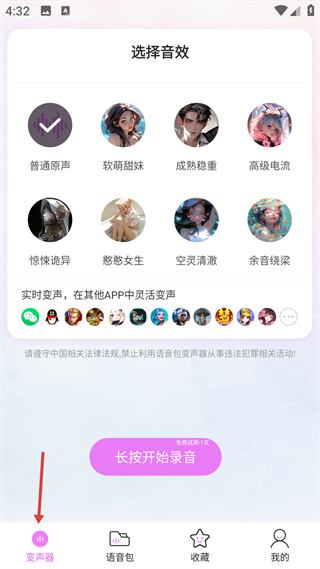 1、進入變聲器頁,可選擇軟萌甜妹等風格的變聲音效,支持實時變聲適配多App,長按錄音即可體驗對應的變聲效果。