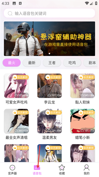 2、進入語音包頁,可按王者吃雞等分類選擇語音包,多數需會員解鎖,能在游戲中通過懸浮窗直接使用語音包。