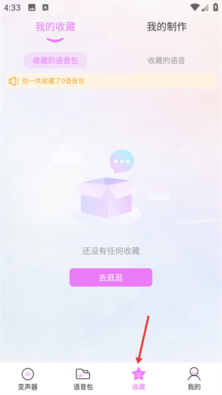 3、進入收藏頁,可管理收藏的語音包和語音,當前無收藏內容時,可點擊去逛逛跳轉瀏覽相關語音資源。