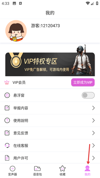 4、進入我的頁,可查看用戶信息,開通VIP會員并設置懸浮窗,同時使用舉報客服等輔助服務功能。