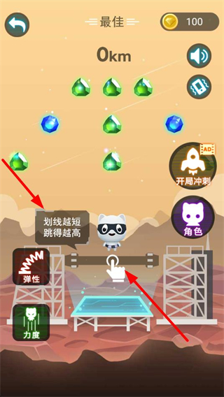 1、按劃線越短跳得越高的提示操作角色,還能通過彈性力度等功能調整,同時可選擇開局沖刺或切換角色。