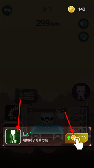 4、可消耗金幣升級力度等屬性,提升繩子的彈力度,助力角色跳得更高更遠,積累更多距離和獎勵。
