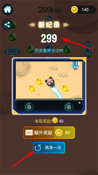 3、旅程結束后會顯示新紀錄和歷史最高分,還有本局獎勵,可選擇額外獎勵或再來一次,再次開啟彈跳挑戰。