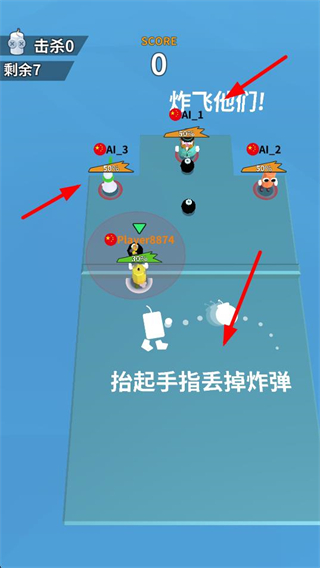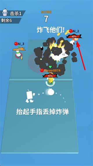 1、看到炸飛他們的提示,控制角色拾起炸彈,按照指引抬起手指丟掉炸彈,瞄準場上的對手,開啟對決流程。