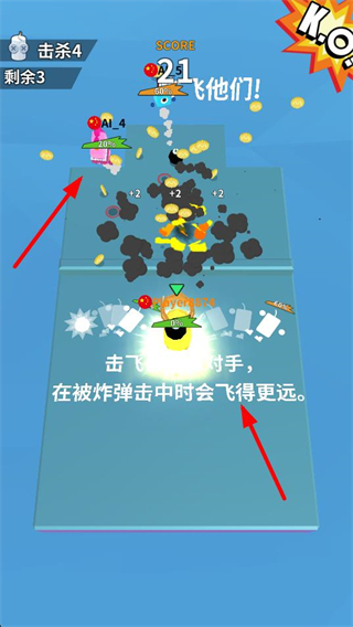 3、留意提示了解擊飛對手的技巧,被炸彈擊中時對手會飛得更遠,借助這一機制攻擊剩余對手,積累更多擊殺數和得分。