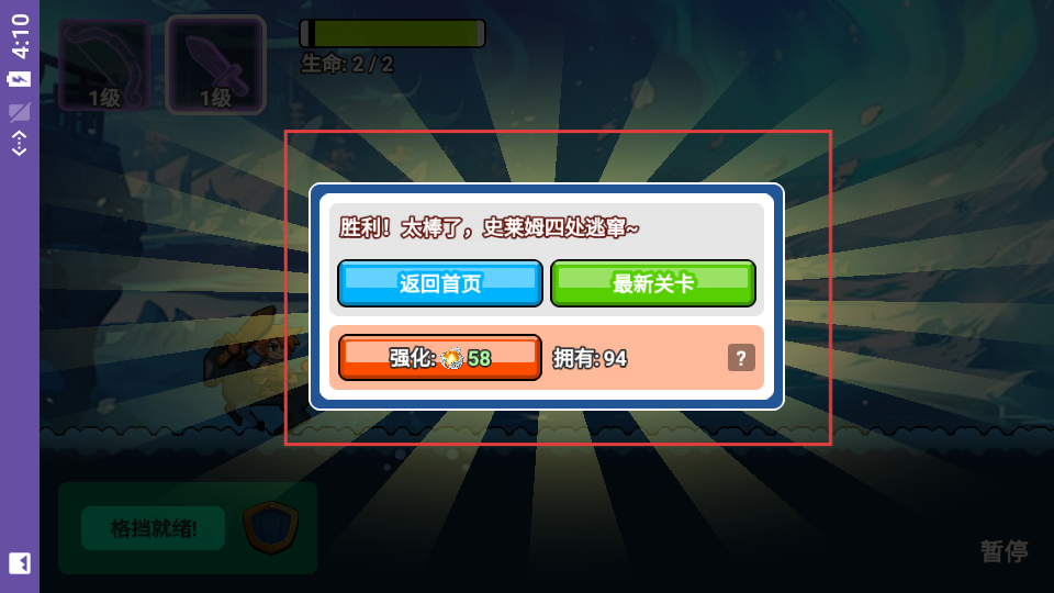 4、擊敗史萊姆后,會彈出勝利界面,能選擇返回首頁,挑戰最新關卡,也能用獲得的強化道具強化,擁有的道具數量也會顯示,方便后續使用。