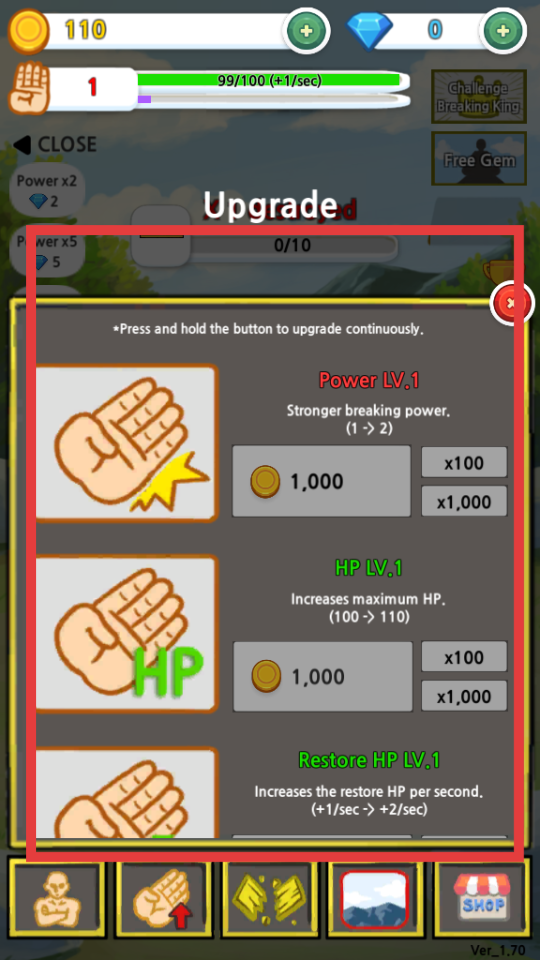 4、積累足夠金幣后,進入升級界面,可升級出拳力量、生命值等屬性,提升角色能力,更好地破壞木板。