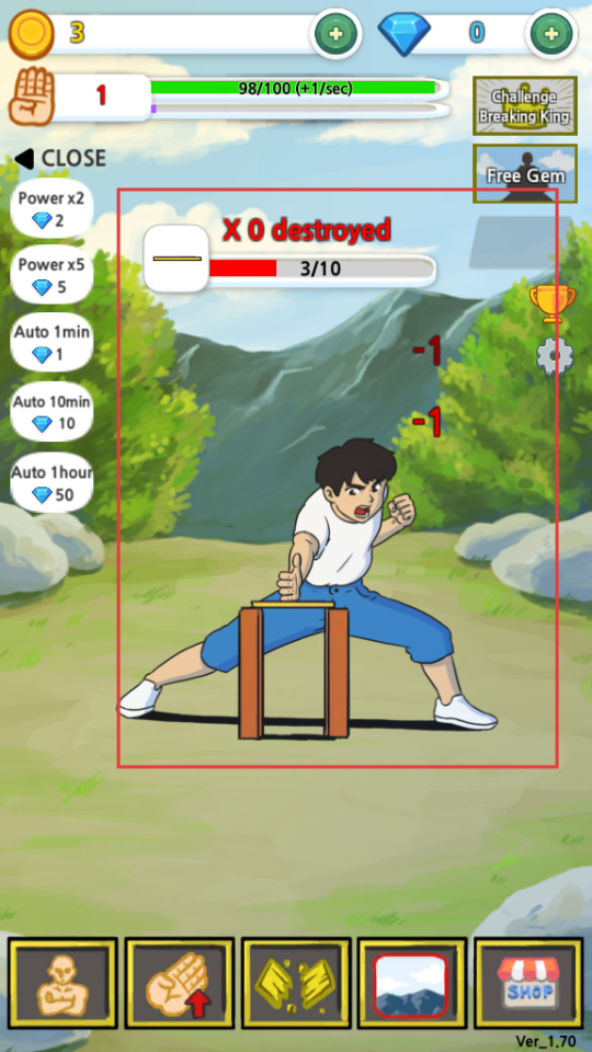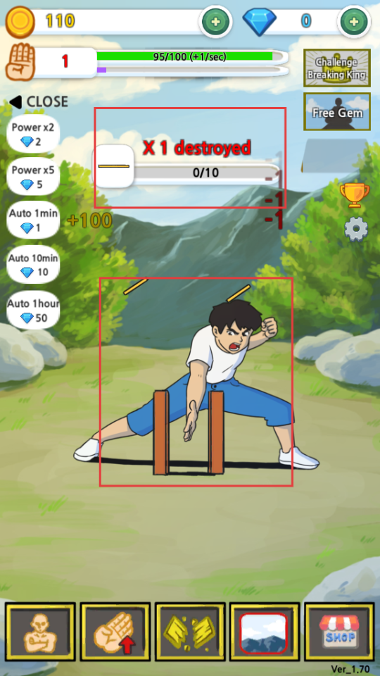 2、點擊屏幕,角色會出拳破壞木板,每次破壞能獲得分數,同時注意木板的耐久度,持續點擊破壞。