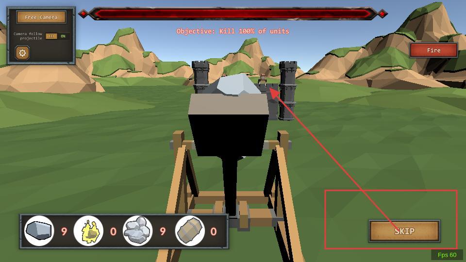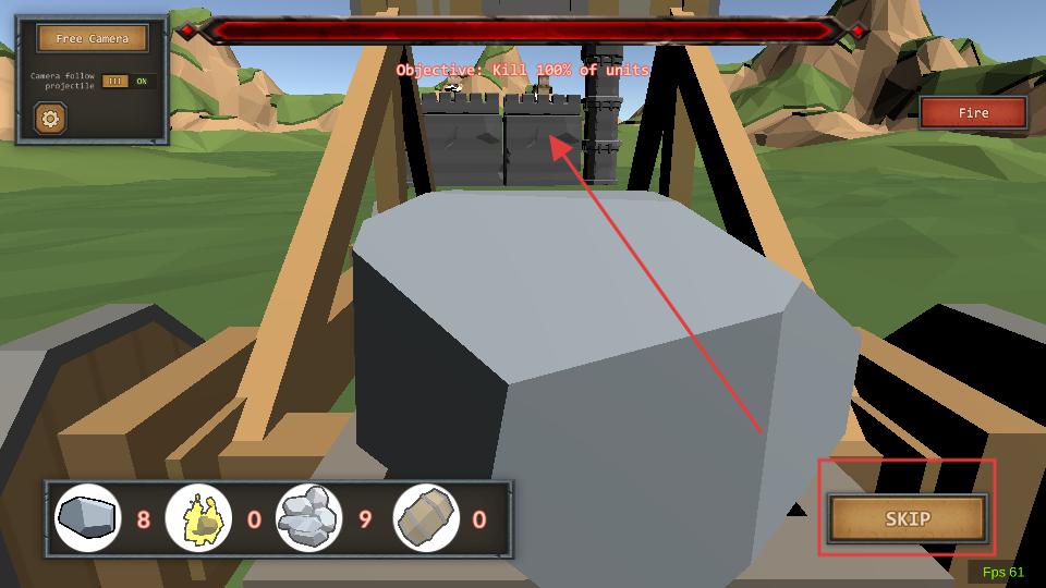 3、裝填好物資后瞄準敵方城堡,點擊skip按鈕,發射物資攻擊敵方城堡,對敵方造成傷害,推進戰斗進程。