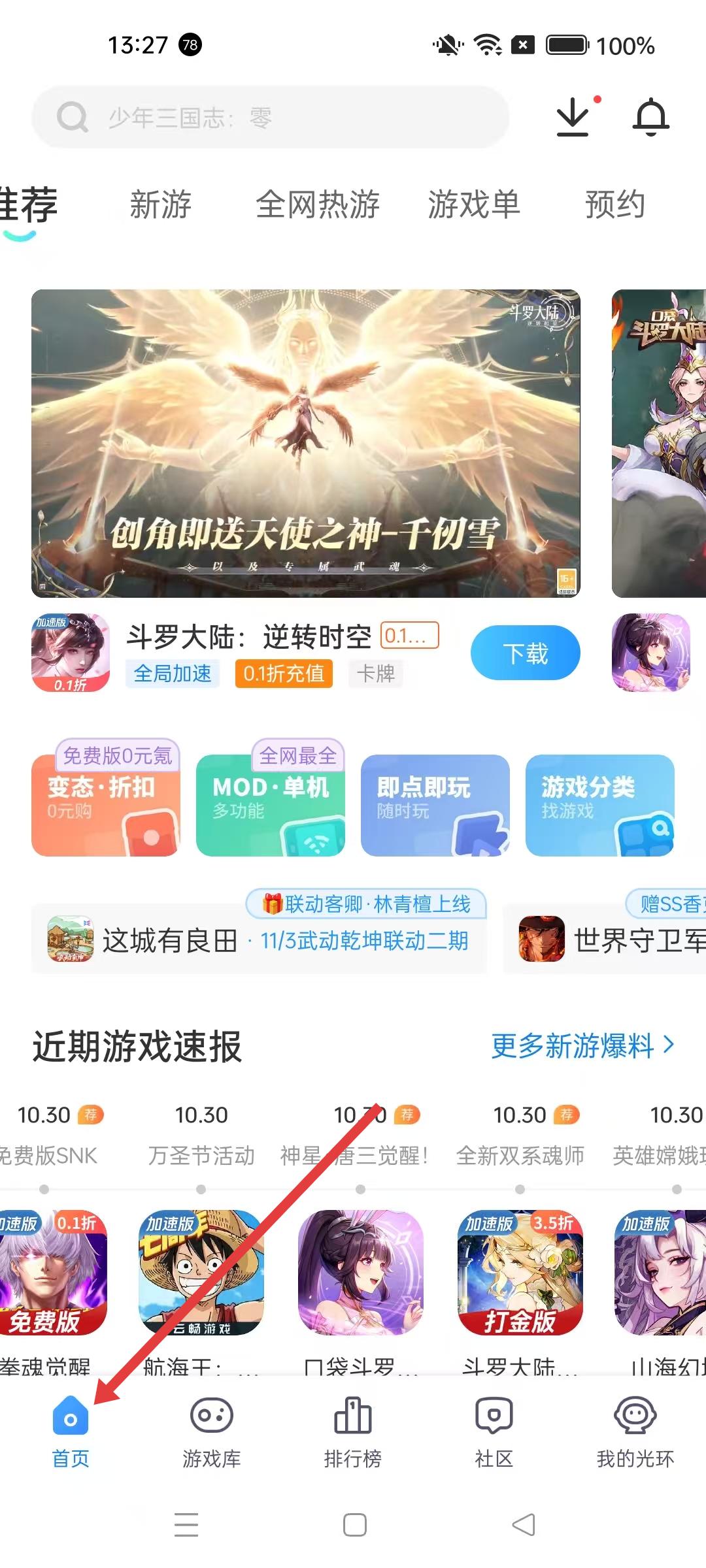 1、進入光環助手首頁,可看到推薦、新游等板塊,還有變態折扣、MOD單機等功能入口,從這里可進入個人中心,開啟退出登錄操作。