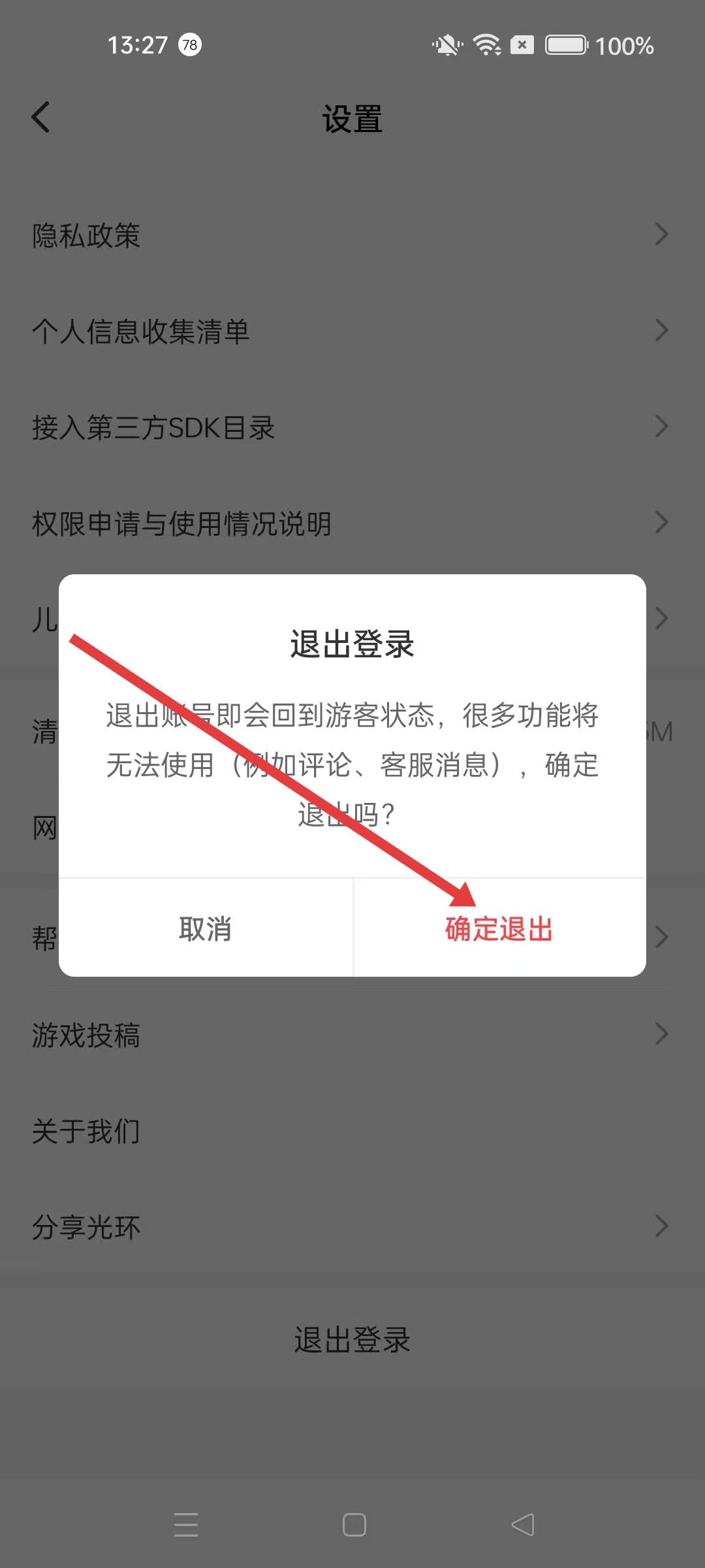 4、退出登錄確認框中,可看到退出賬號的提示信息,點擊確定退出按鈕,即可完成退出登錄操作,回到游客狀態。