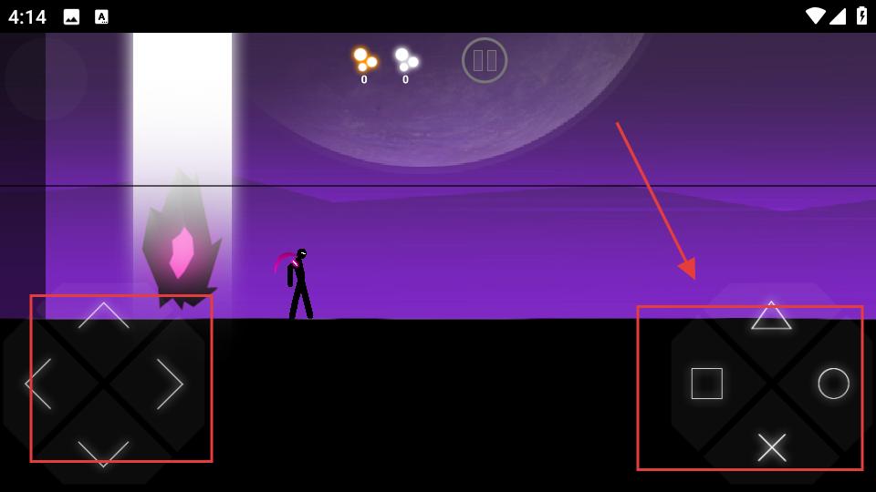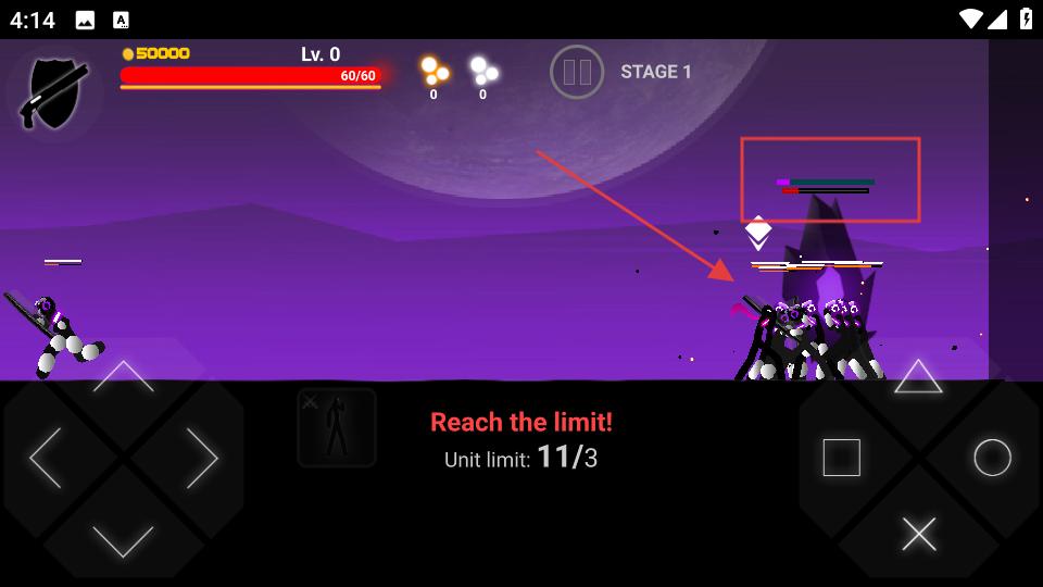 2、在戰斗場景中通過左側的方向按鈕操控火柴人移動,利用右側的攻擊按鈕,對敵人發起攻擊,與敵人展開戰斗。