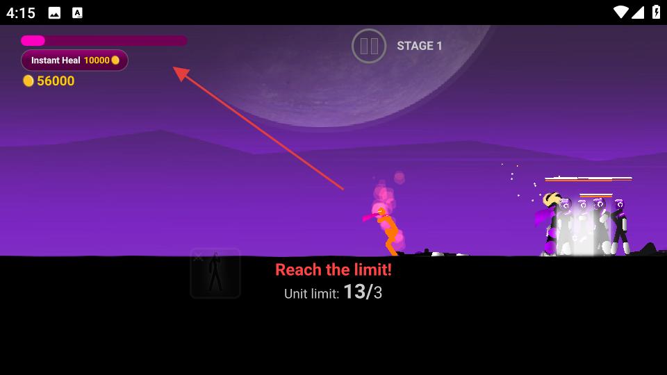 4、若火柴人生命值不足,可點擊界面上的InstantHeal按鈕,消耗金幣為火柴人恢復生命值,繼續投入戰斗,爭取在關卡中取得勝利。