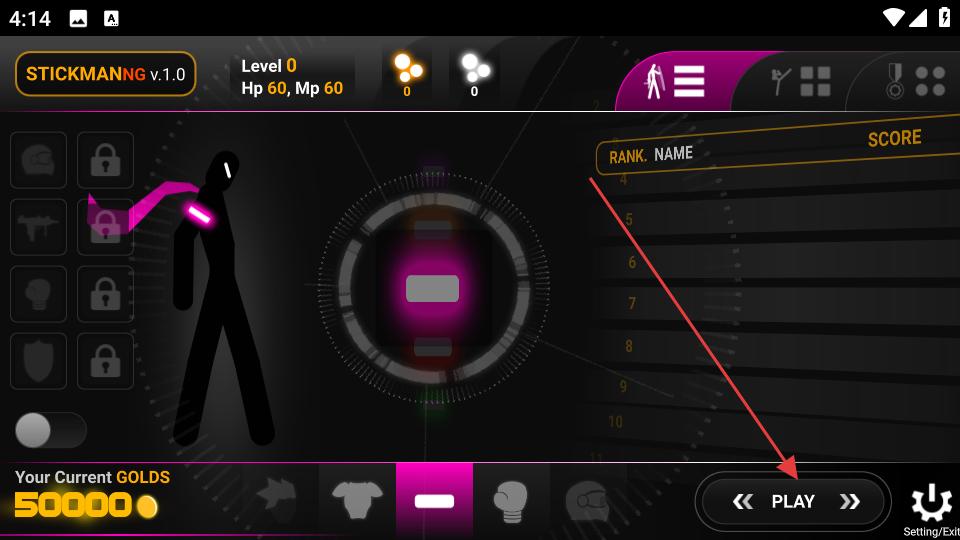 1、進入火柴人新黑幫游戲,看到PLAY按鈕點擊PLAY按鈕,進入帶有紫色背景和特殊晶體的戰斗場景,準備操控火柴人戰斗。