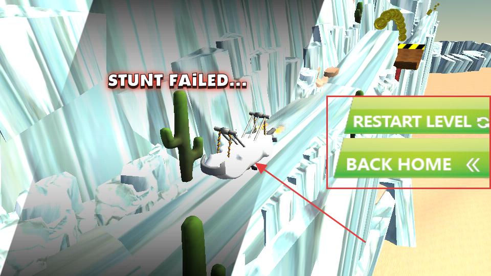 4、在行駛過程中嘗試做出特技動作,若特技失敗,會看到STUNTFAILED的提示,此時可選擇RESTARTLEVEL按鈕,重新開始當前關卡。