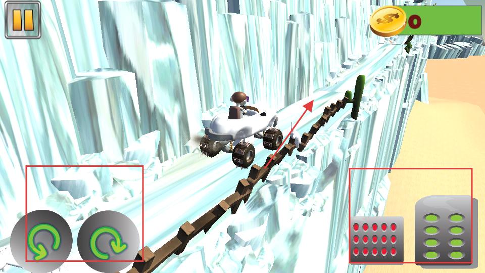 3、進入關卡1后操控汽車在冰雪覆蓋的崎嶇賽道上行駛,使用左側的方向按鈕調整汽車方向,利用右側的按鈕控制汽車的加速與特技動作。