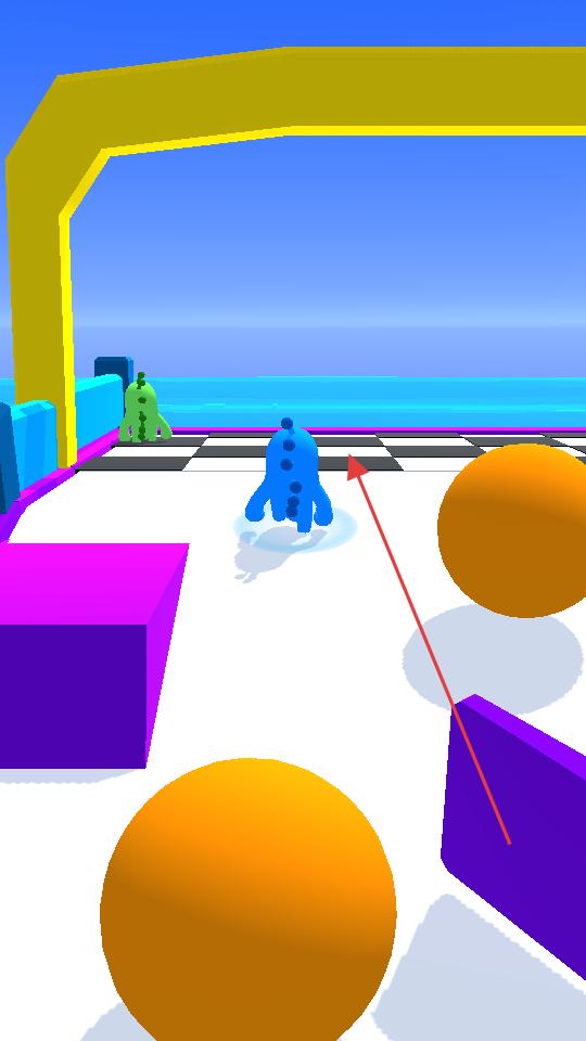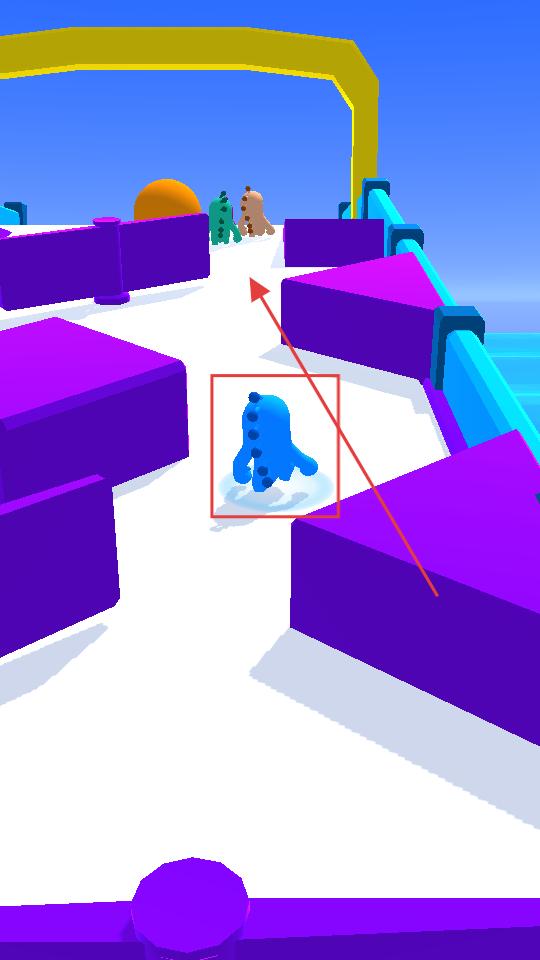 3、接近迷宮出口時加快藍色橡皮人的移動速度,超越前方的綠色橡皮人,朝著黑白格子的終點區域沖刺。