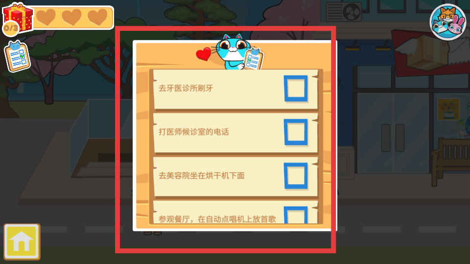 2、游戲中會出現任務清單,上面列出諸如去牙醫診所刷牙,打候診室電話等任務,按照清單提示,前往對應的地點,開展任務操作。