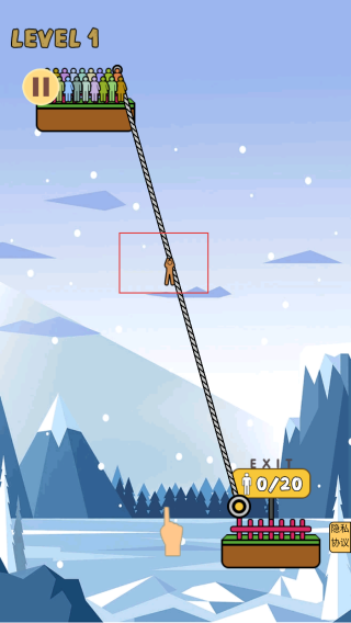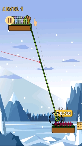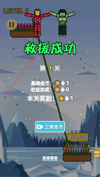 2、進入關卡后玩家通過點擊屏幕或按指引操作,讓超人從高處借助繩索蕩下,去救援平臺上的人。