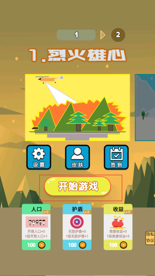 1、玩家下載游戲之后,在游戲初始界面點擊開始游戲按鈕,選擇烈火雄心等關卡主題,進入關卡挑戰。