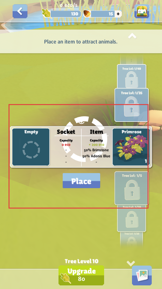 2、放置物品來吸引動物,比如選Primrose,點擊Place按鈕放到合適位置,不同物品吸引動物的概率不同,能豐富生態。