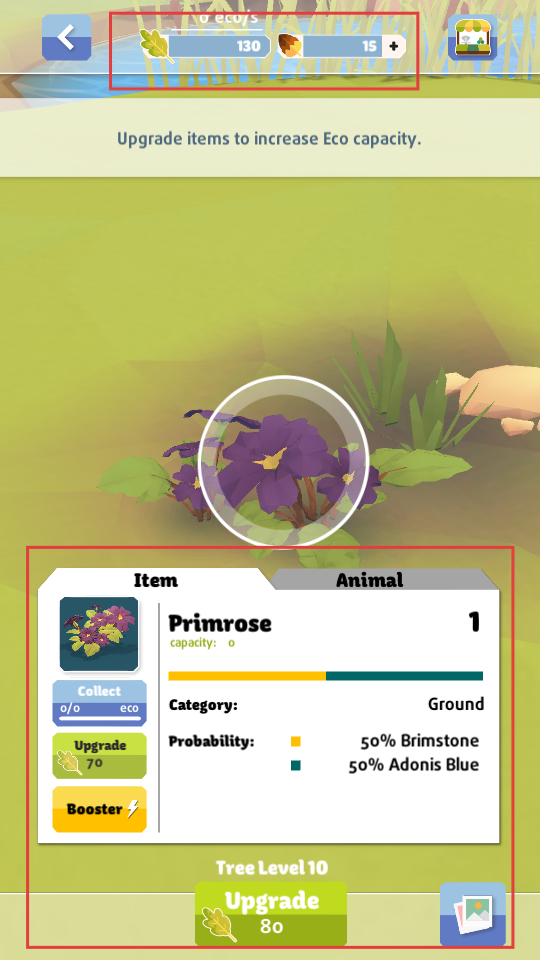3、升級物品能提升生態容量,點擊Upgrade按鈕消耗對應資源,升級后物品吸引動物的效果更好,還能查看相關動物概率。