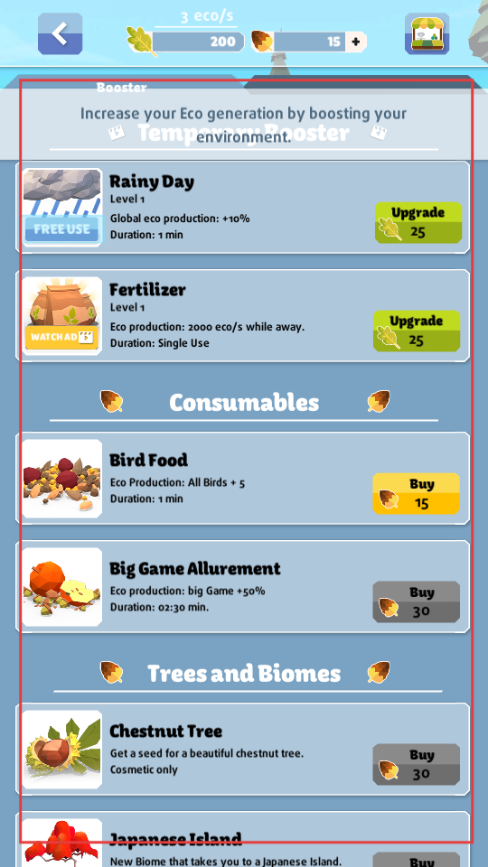 4、使用各類道具,比如Rainy Day能提升全球生態產量,Fertilizer在離線時也能產生態,還有Bird Food等,助力生態發展,也能購買新樹和生物群落。