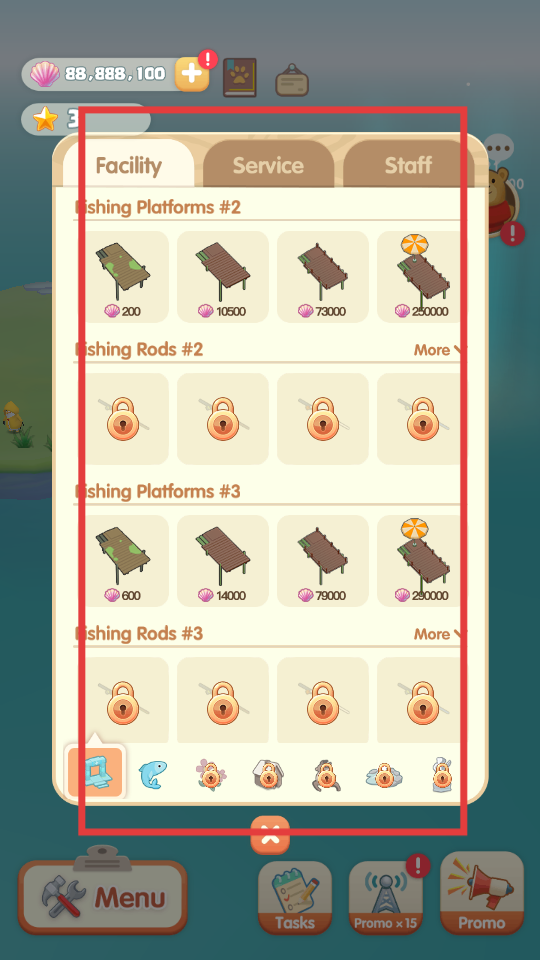 4、最后在菜單的設施界面,能看到多種可升級或解鎖的設施,花費相應的貝殼等資源,可升級現有設施或解鎖新設施,進一步優化島嶼的運營。