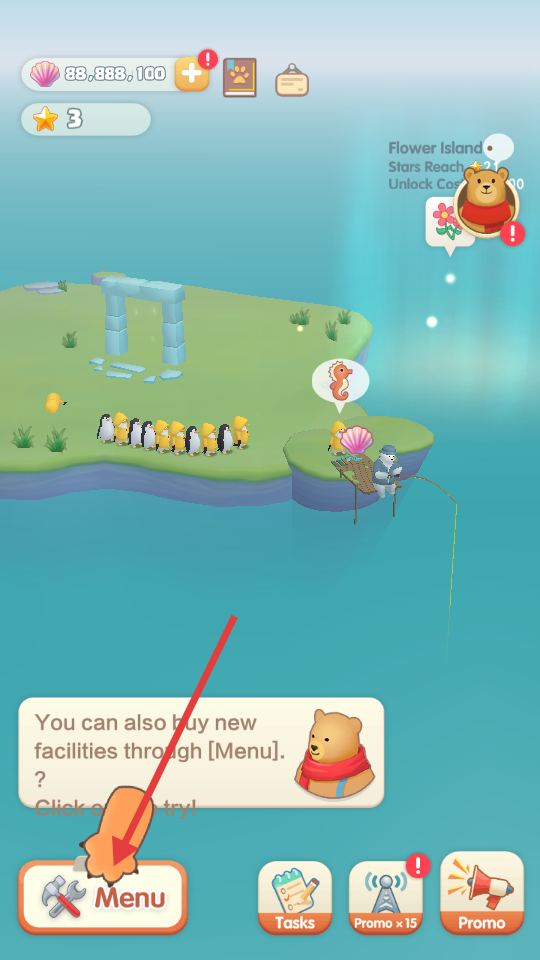 3、然后點擊Menu按鈕進入菜單界面,在這里可以購買新的設施,通過建設這些設施完善島嶼的功能,提升島嶼的運營能力,讓島嶼能開展更多活動。