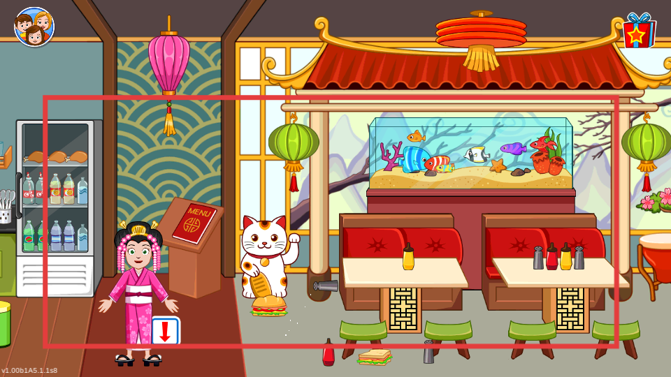 4、進入店鋪后可在店內自由探索,能看到裝飾的燈籠、魚缸,還有菜單、飲料柜等物品,與店內的角色互動,體驗在餐館里的各種可能。