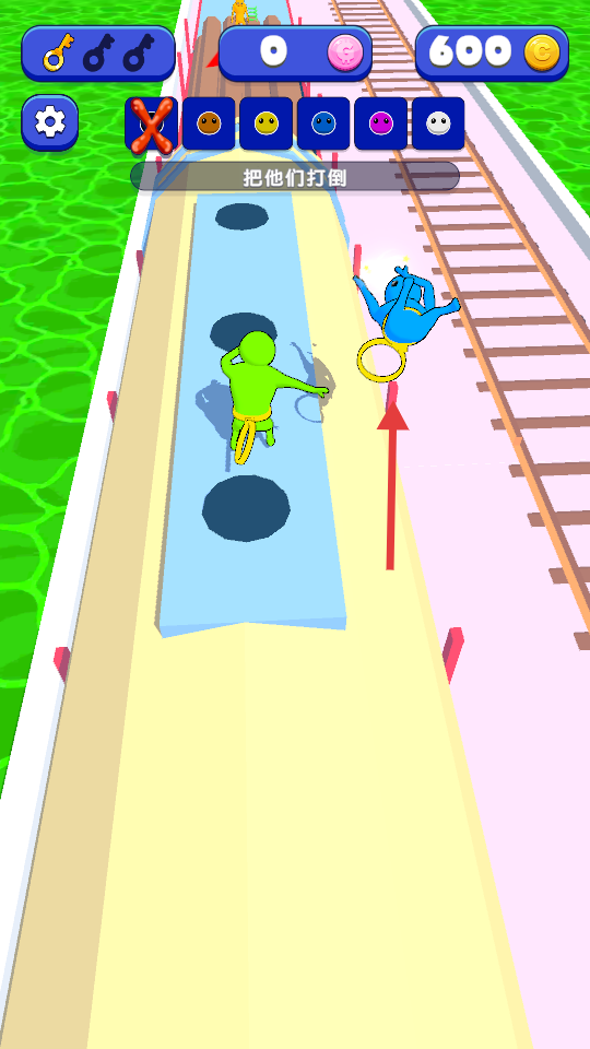 2、進入游戲在賽道上,要應對不同顏色的對手,通過操作把對手打倒,同時注意躲避賽道上的孔洞等障礙,然后將對手甩飛出去,將所有對手丟出賽道即為勝利。