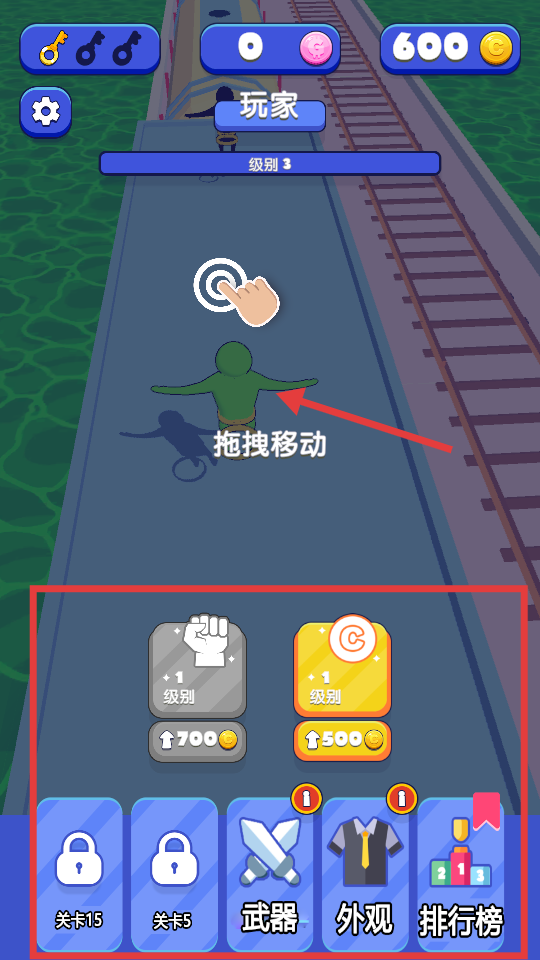 1、游戲開始通過拖拽來移動角色,可利用金幣提升級別,還能解鎖武器、外觀等,也能查看排行榜,了解自己與其他玩家的排名情況。