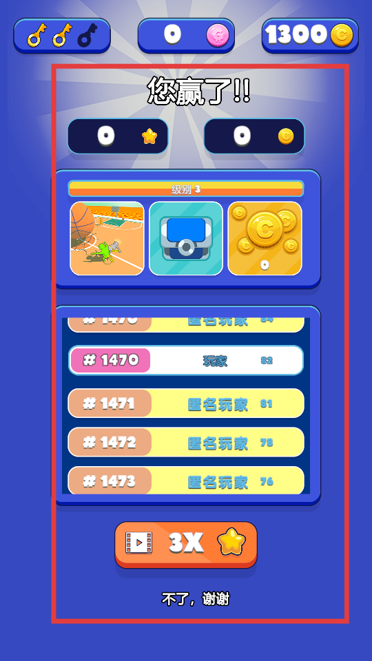 3、成功獲勝后會顯示您贏了,能看到星級、金幣等獎勵,還有目前玩家排名,可選擇看視頻獲得3倍獎勵,也能直接進入下一輪。