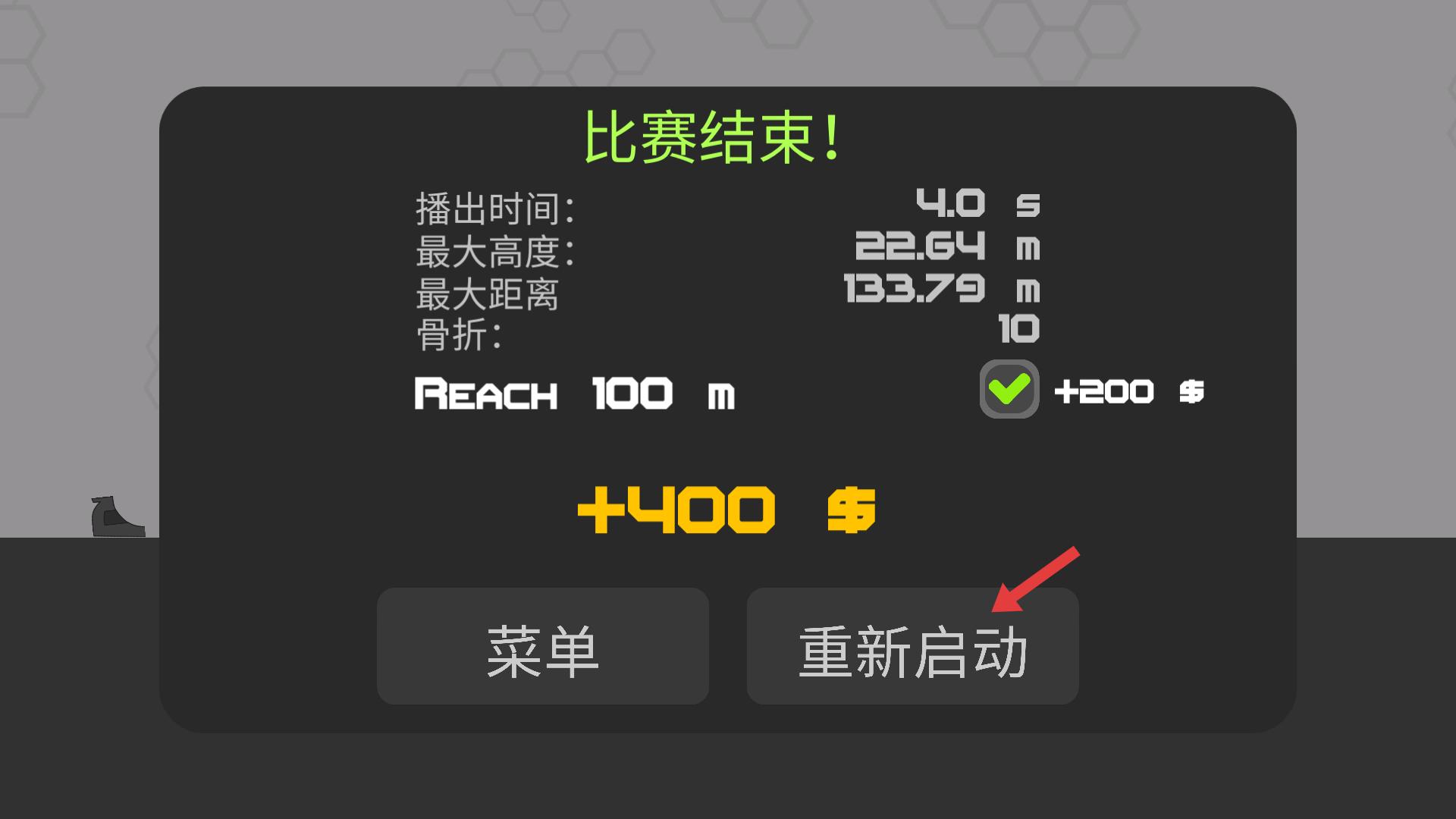 4、比賽結束后,界面會顯示播出時間、最大高度等數據,還能獲得貨幣獎勵,若想再次挑戰,點擊【重新啟動】按鈕即可。