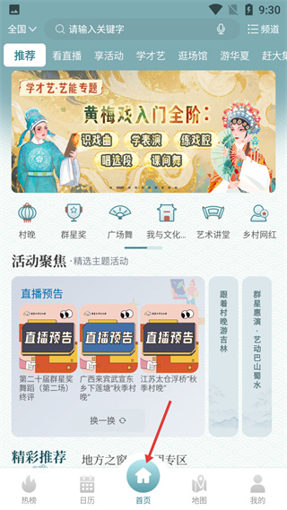 1、首頁有黃梅戲入門專題,還有村晚、群星獎等功能入口,活動聚焦有直播預告和精選活動,助力用戶參與文化活動。