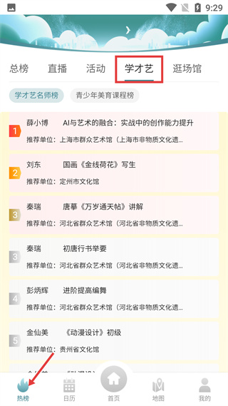 3、熱榜學才藝頁有學才藝名師榜和青少年美育課程榜,涵蓋AI與藝術、國畫、書法等藝術課程,助力用戶提升藝術技能。