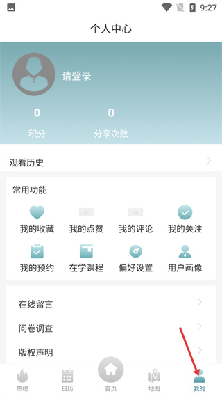 4、個人中心頁,可登錄查看積分和分享次數,有觀看歷史、常用功能及在線留言等板塊,方便用戶管理個人文化學習與互動記錄。