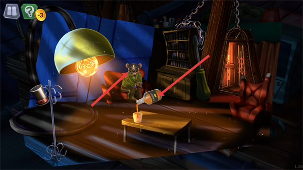 8.到右側桌子,將玫瑰花放入右側的瓶子中,然后用木棍搗碎,再加入水杯做成紅色顏料。用羽毛筆沾顏料,然后為紙張上的圖案上色。顏色即為電腦中顯示的顏。