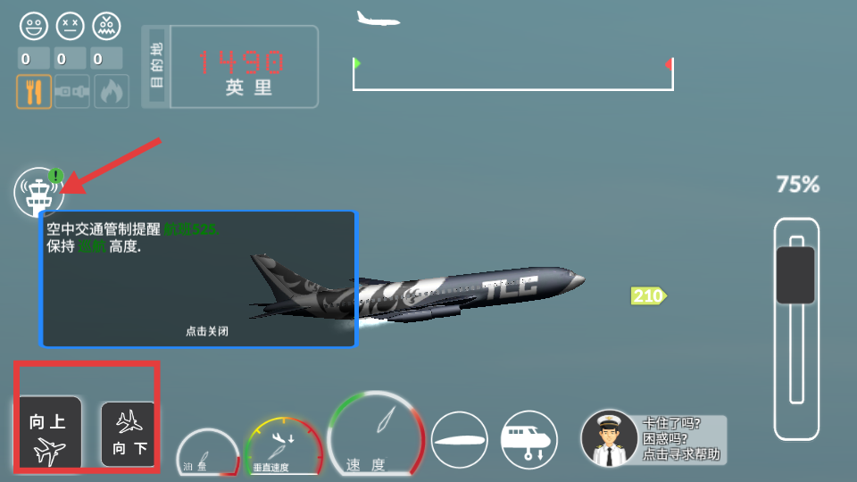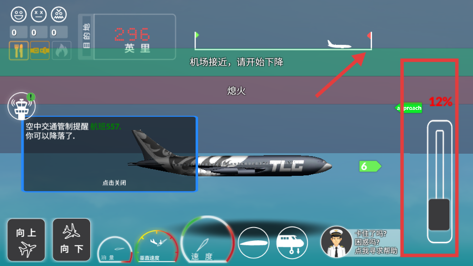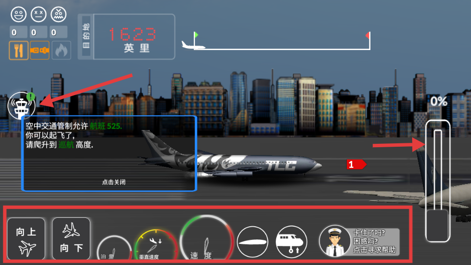 1、進入首先要關注空中交通管制提示,當收到允許起飛的指令后,利用下方向上向下等操控按鈕,結合油量、垂直速度、速度等儀表,操控飛機從跑道起飛。